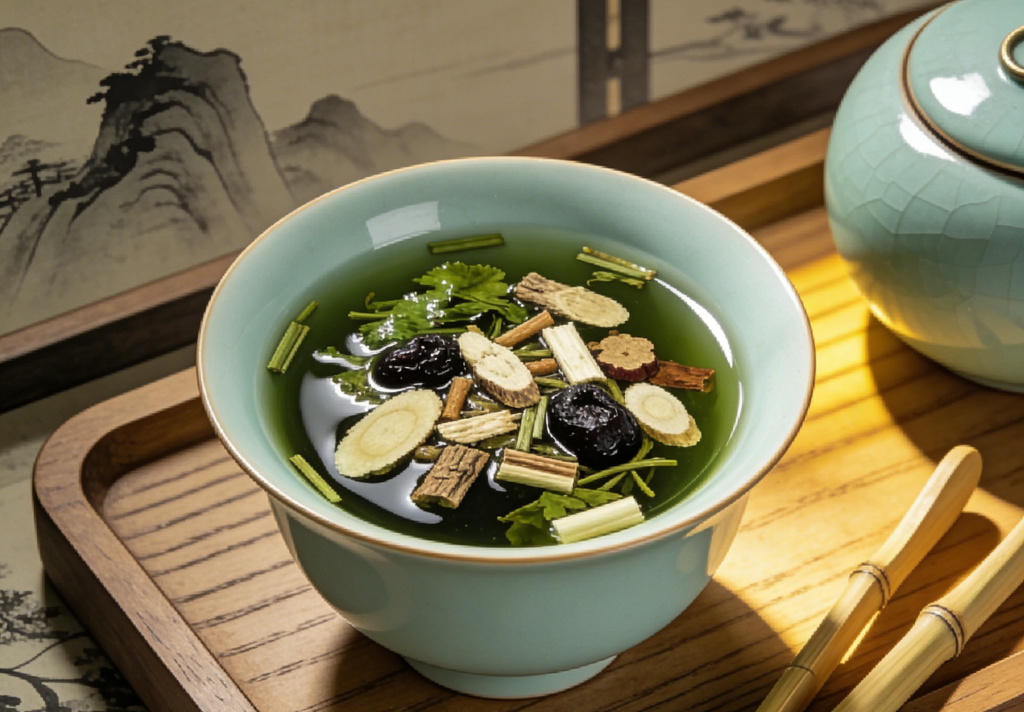 将上述所有材料(除了绿茶末)放在一起,研成粗末后,再将绿茶末也一起装入茶包袋中或者直接放入杯中,加水适量煎煮至沸后,稍事冷却,即可服用。